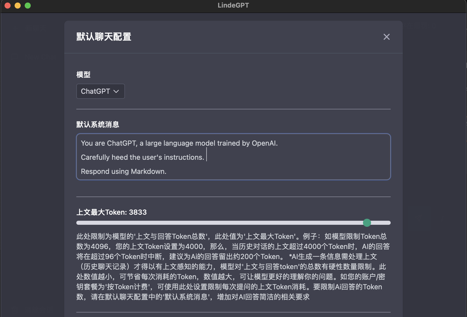 ChatGPT模型配置本页总览模型配置如文档 不明确 或 没有解决 您的问题,请联系技术客服为您解决当前会话的模型配置要更改当前会话的配置,轻点 -> 会话顶部的模型配置,打开配置界面,按需配置即可默认聊天设置 / 默认系统角色消息要更改每次新建会话时的的默认模型配置与默认系统角色消息:主界面左下角 -> 设置 -> 默认聊天设置(手机界面需先轻点左上角`三`按钮 展开侧边栏)更改设置后,点击确认