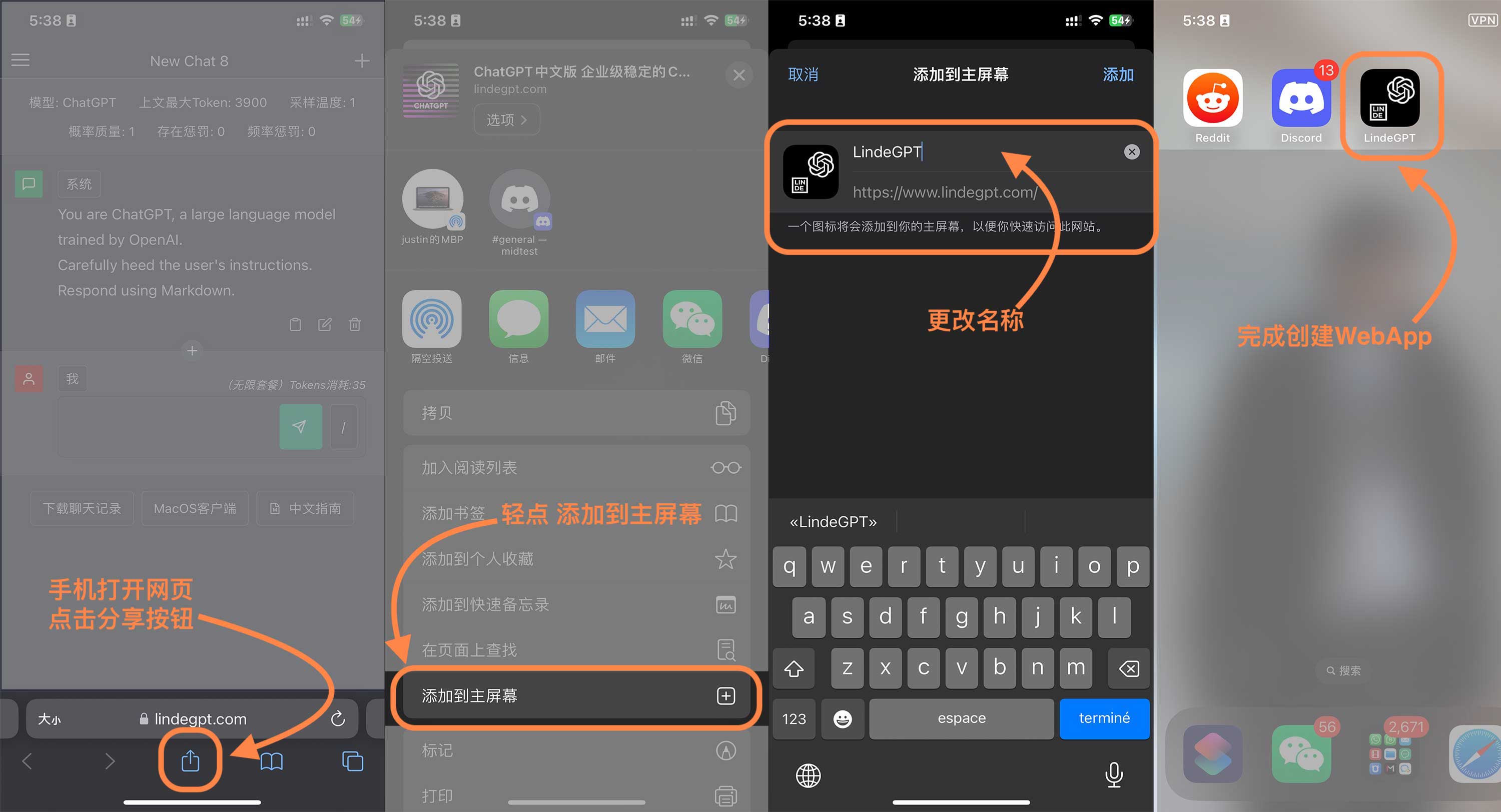 我们正在开发Appstore的iOS客户端,在此之前,您可将LindeGPT直接添加到您iOS手机桌面,与网页和客户端相同,可本地存储您的聊天记录与您的密钥或者账户,无需重复登陆,即开即用。