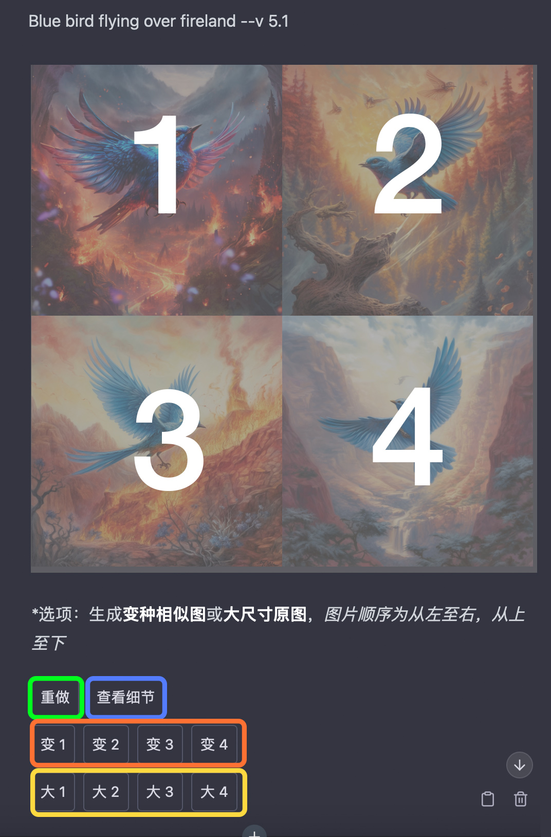 重做- 重新用生成当前选项图片的作图魔咒再生成一遍查看细节- 将用浏览器打开当前选项图,供您查看细节变1、变2、变3、变4- 将相应序号的图片,以相同的构图、主体、风格生成4张轻微变种图片供您选择大1、大2、大3、大4- 将相应序号的图片,生成大尺寸的单个图片