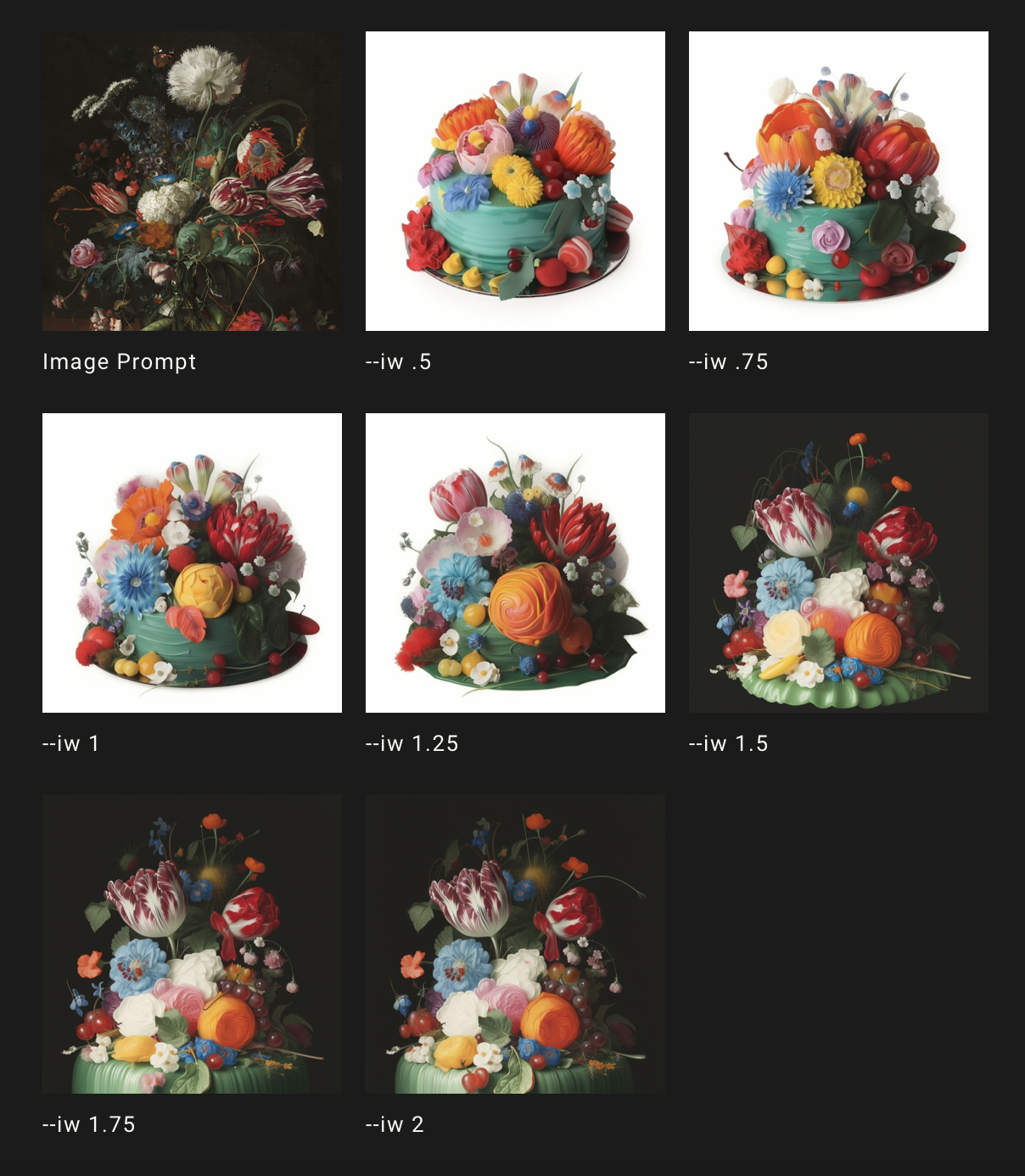 --iw <数值>是使用垫图魔咒时的专用参数,垫图权重参数调整作图魔咒中的图像与文本部分的重要性。较高的--iw值意味着垫图的图片将对完成的作业具有更大的影响力,