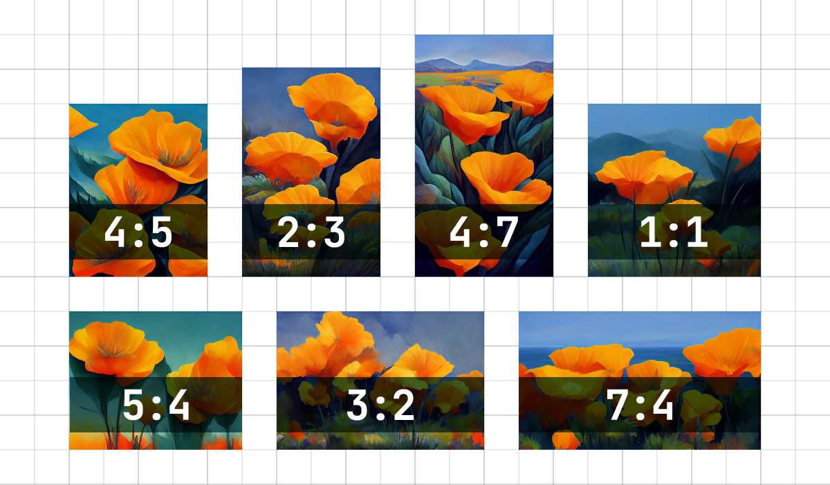 --ar参数接受从1:1(正方形)到每个模型的最大宽高比的任何宽高比。然而,在图像生成或放大过程中,最终输出可能会略微修改。例如:使用--ar 16:9(1.78)的提示将创建具有7:4(1.75)宽高比的图像。