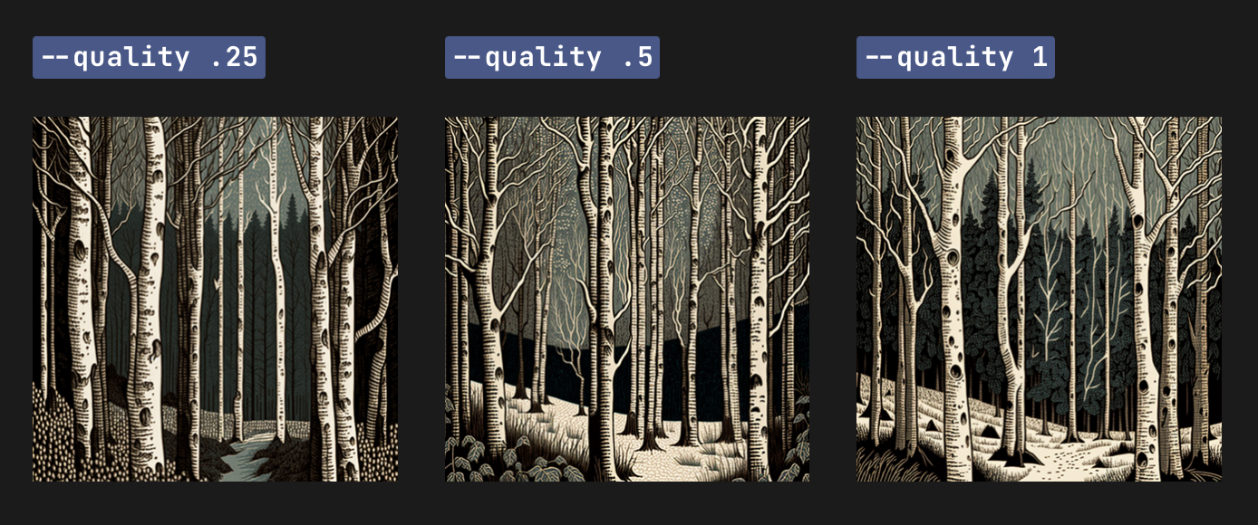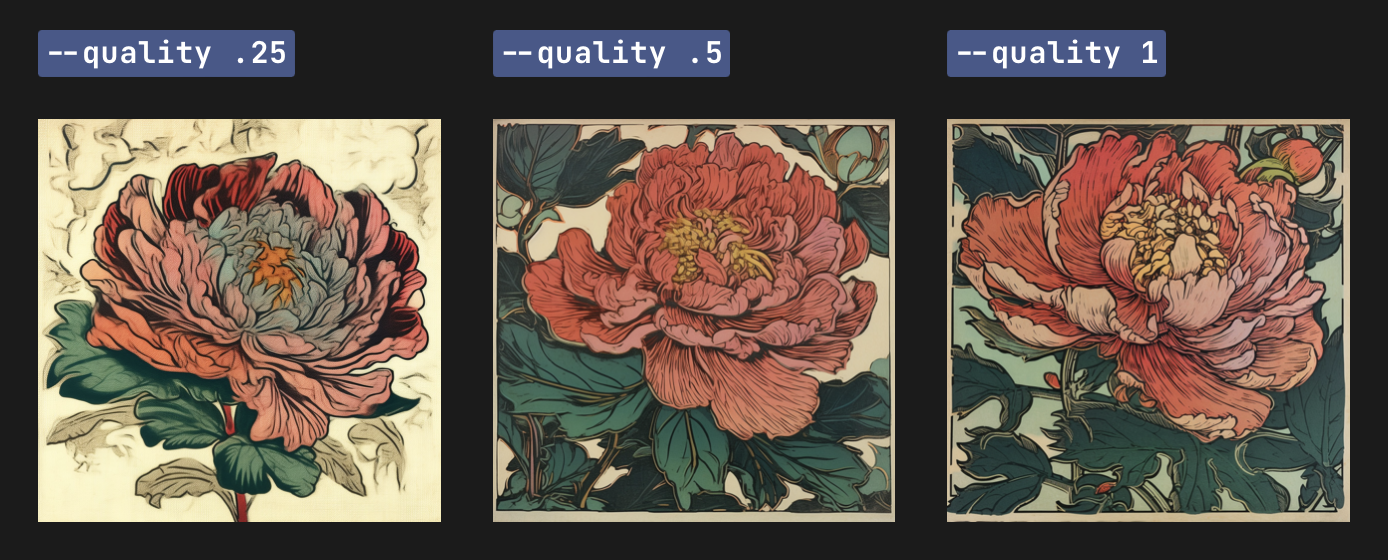 较高的--q设置并不总是更好,有时,较低的--quality设置可以产生更好的结果,这取决于您尝试创建的图像类型: