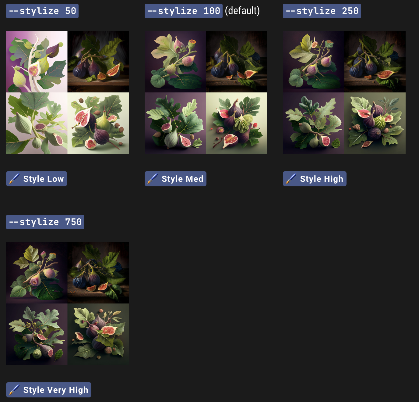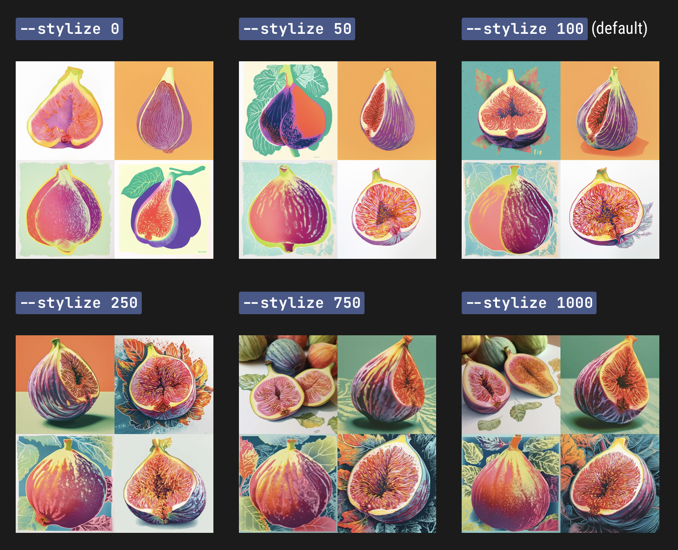 Midjourney被训练生成偏好艺术颜色、构图和形式的图像。--s <数字0-1000/60000>参数影响这个功能如何应用: