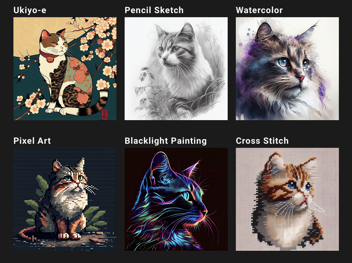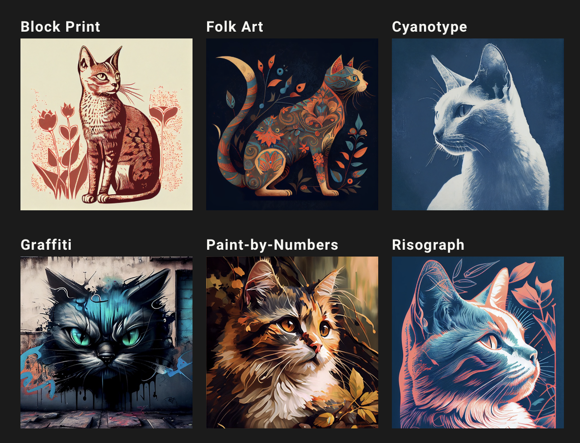 指定艺术媒介是生成优质图像的最佳方法之一,尝试指定绘画、蜡笔、刮板、印刷机、闪粉、墨水、彩色纸张等